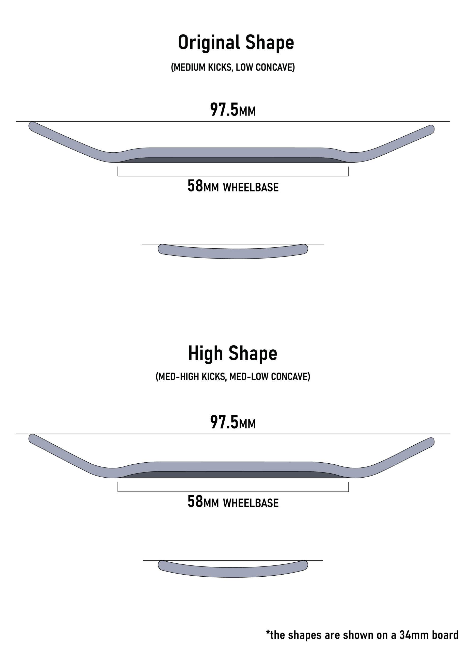 *All boards are ~0.3mm wider to make sure the trucks don’t stick out from the sides. For an example, a 34mm board is actually around 34.3mm wide.